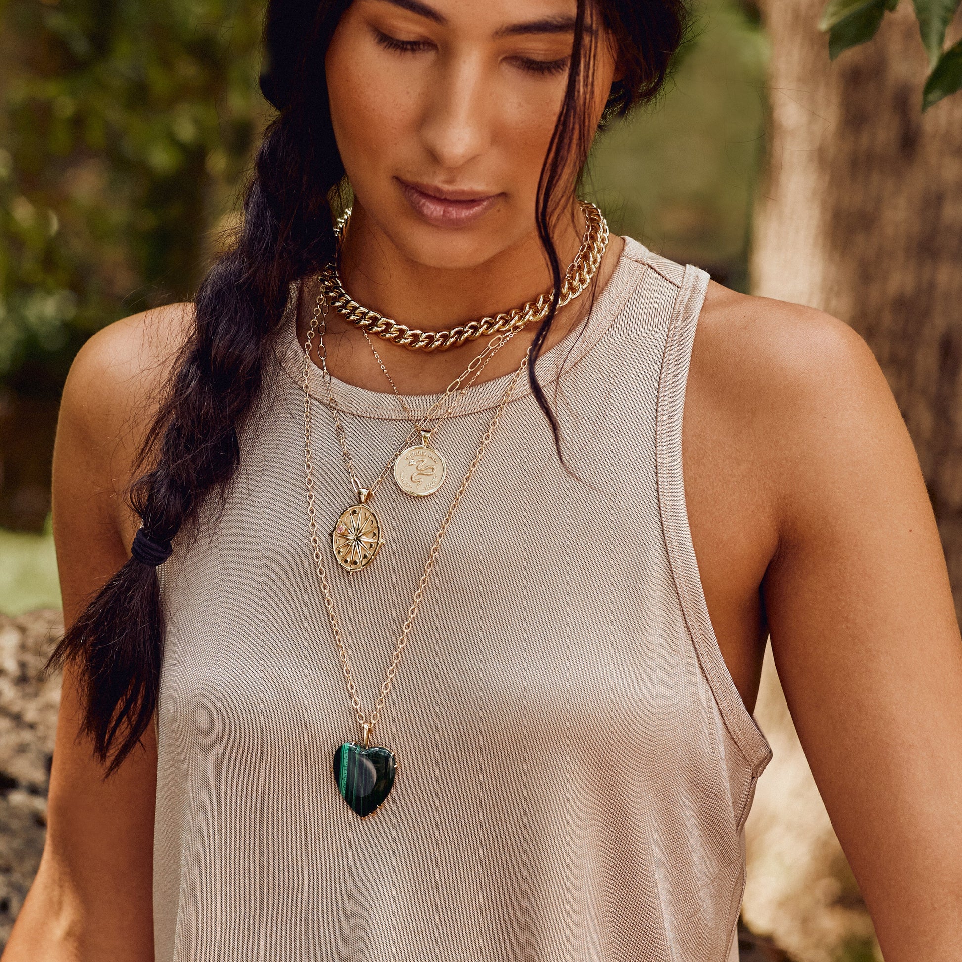 A stunning, statement curb chain necklace with a malachite bead and JW logo. This choker style chain sits high on the neck at 16" length or a little longer at 18" length. Wear with the clasp in the back or turn it around to the front to hang your pendant from it!