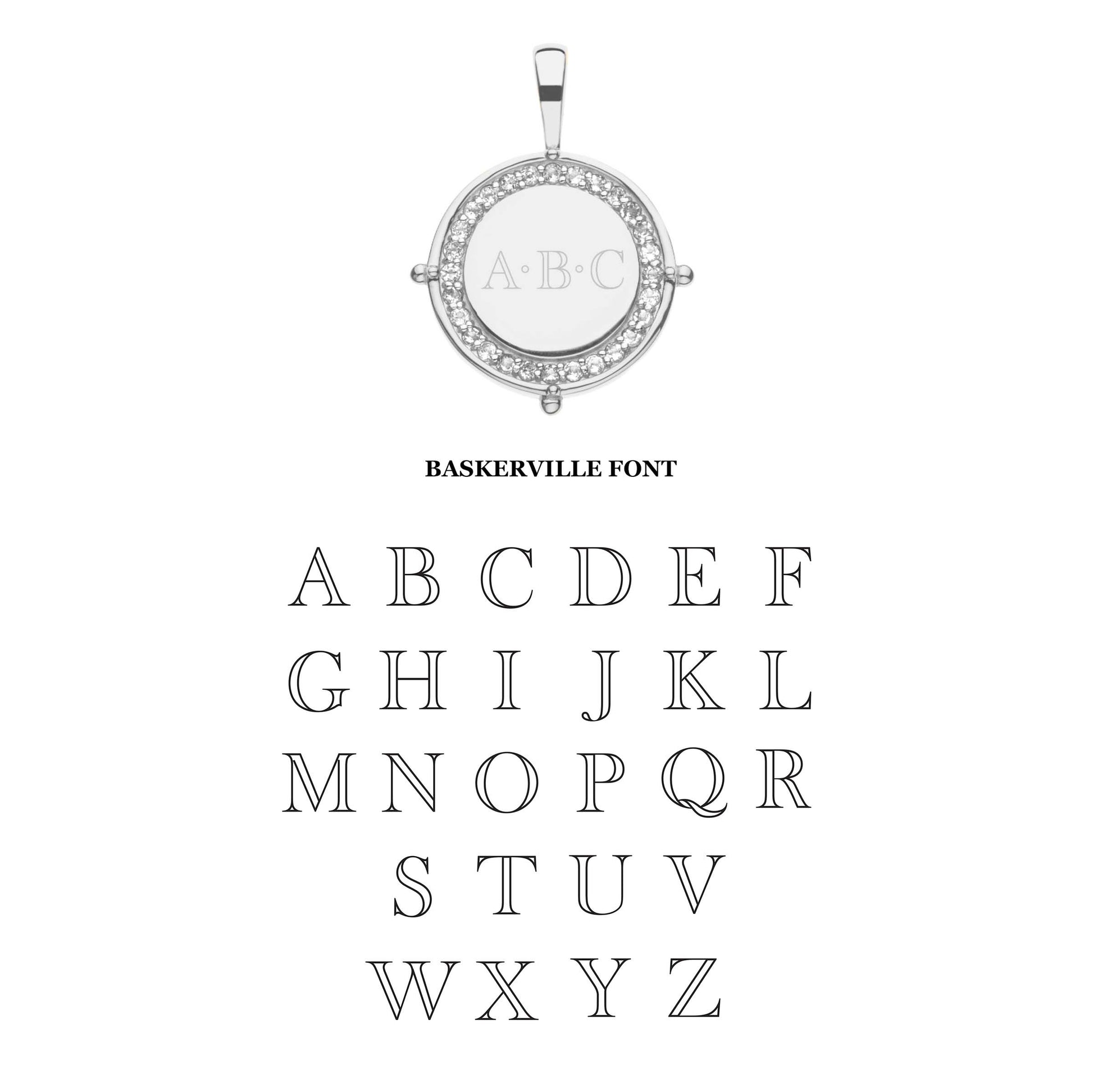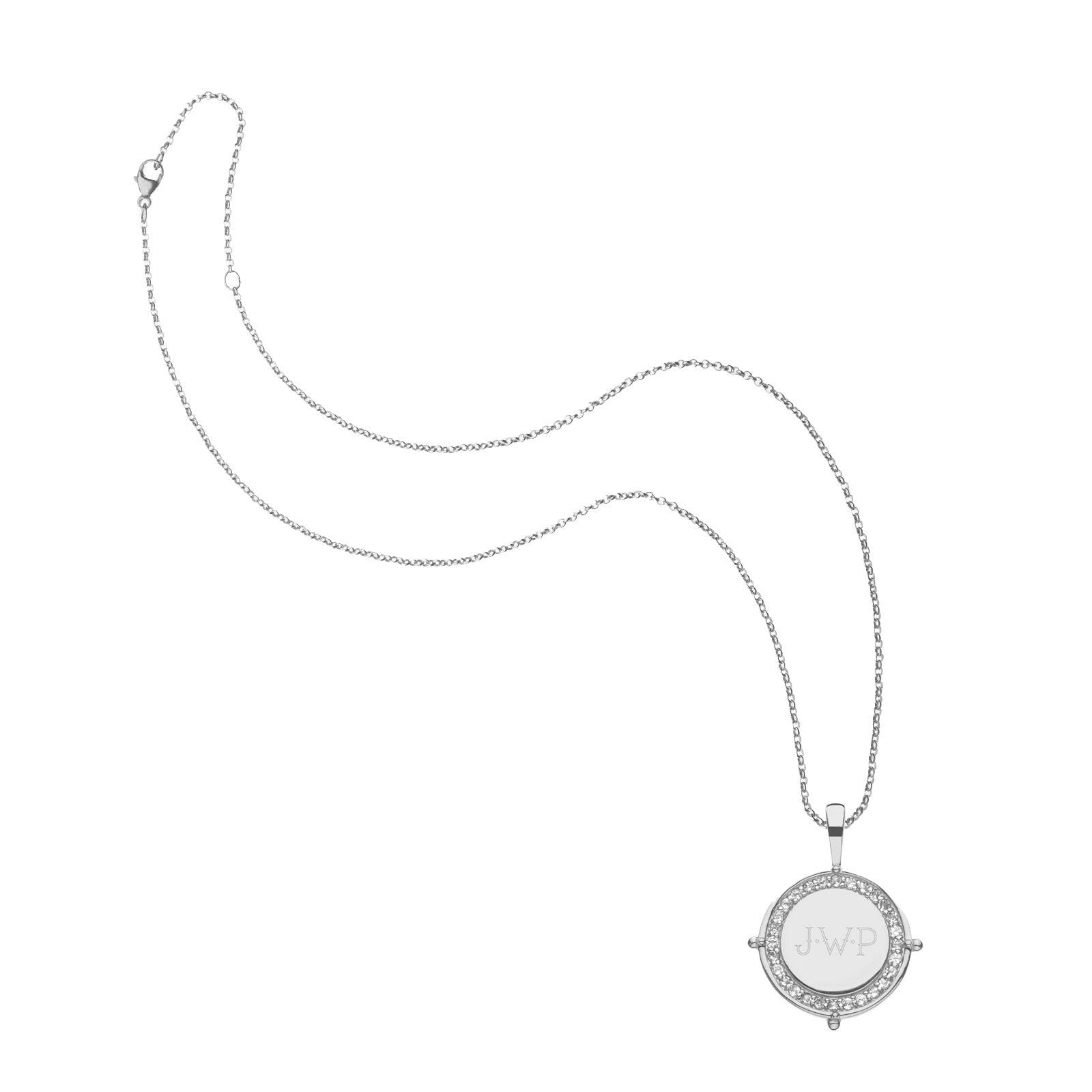 For the lover of the classic monogram paired with our signature double sided coin, this pendant has a high shine front side, ready for engraving, surrounded by a ring of sparkling white topaz stones. Flip it over to wear the crescent moon and star design.