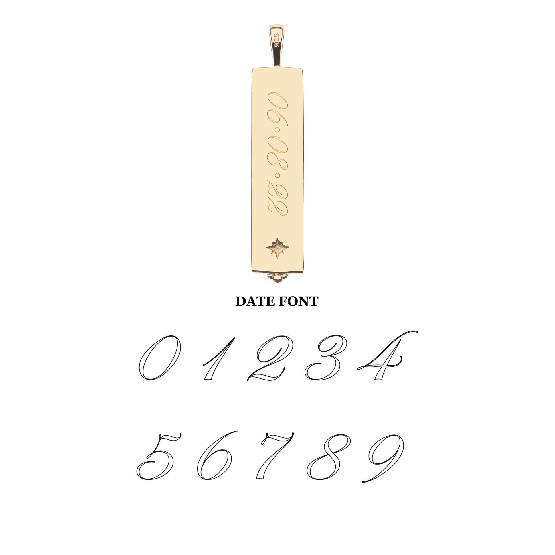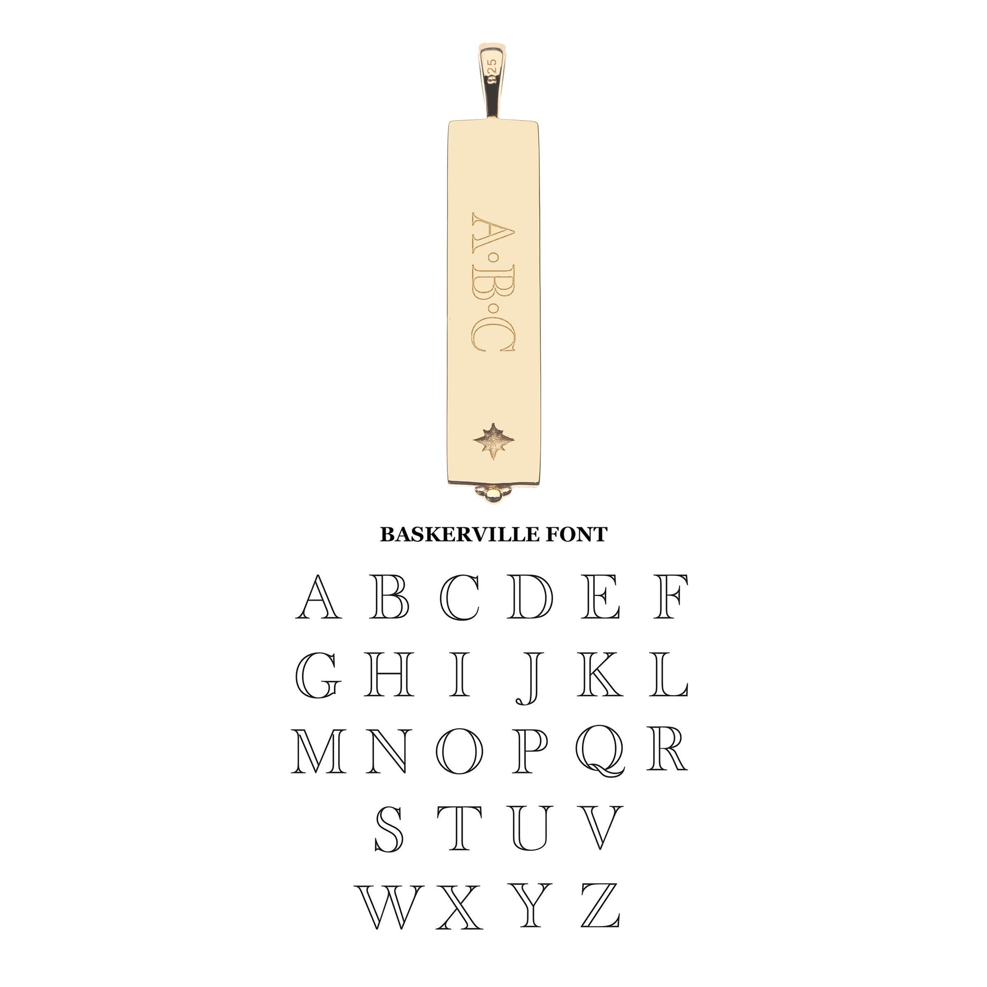 Personalize this pendant by selecting three letters or a date to engrave! For the initials, we offer the Baskerville Font, and for the date we offer a Script font. A delicate dot separates the letters and date.