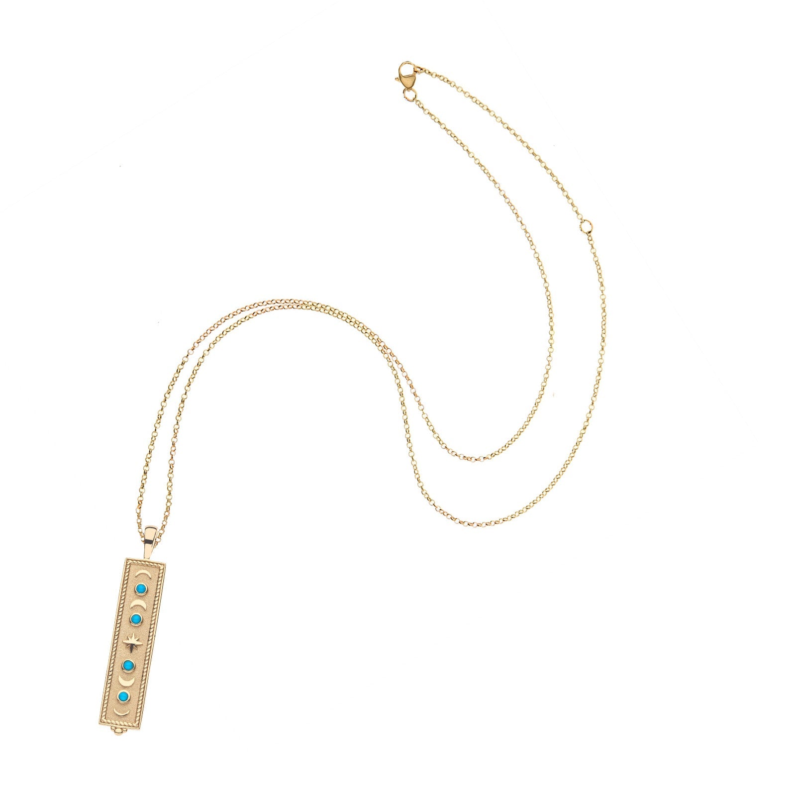 • Pendant made of sterling silver heavily plated in 14k gold, and accented with cabochon Turquoise stones.