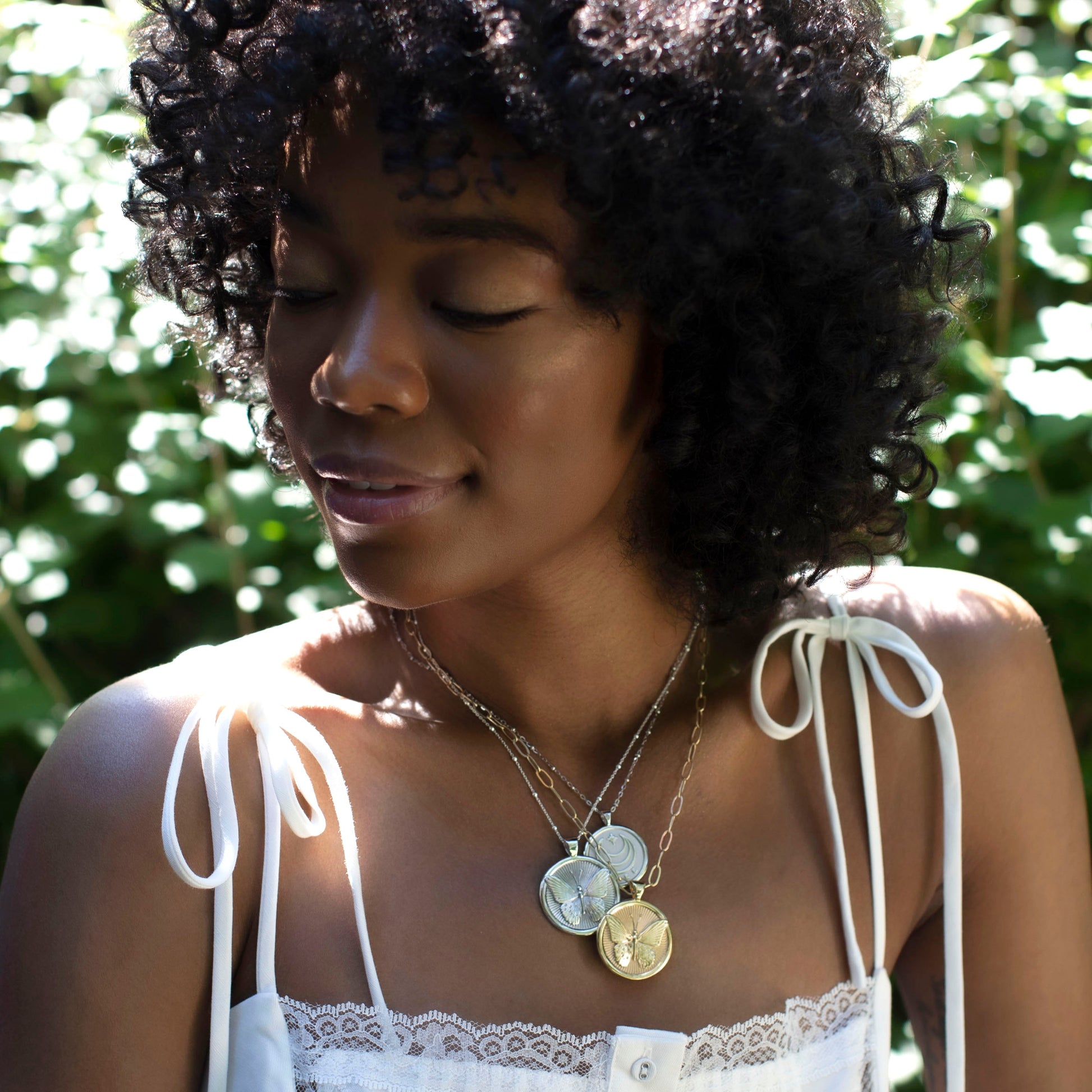 Coin pendant made of sterling silver dipped in rhodium, measuring 1.2" in diameter.