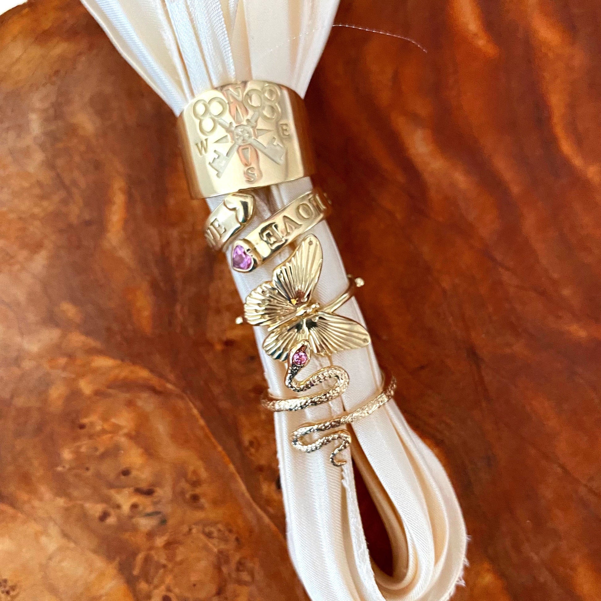 We transformed our Freedom Butterfly into a twisted-band ring with seven lucky dots along the band - only you know the secret of having the word "free" held close to you on the inside.