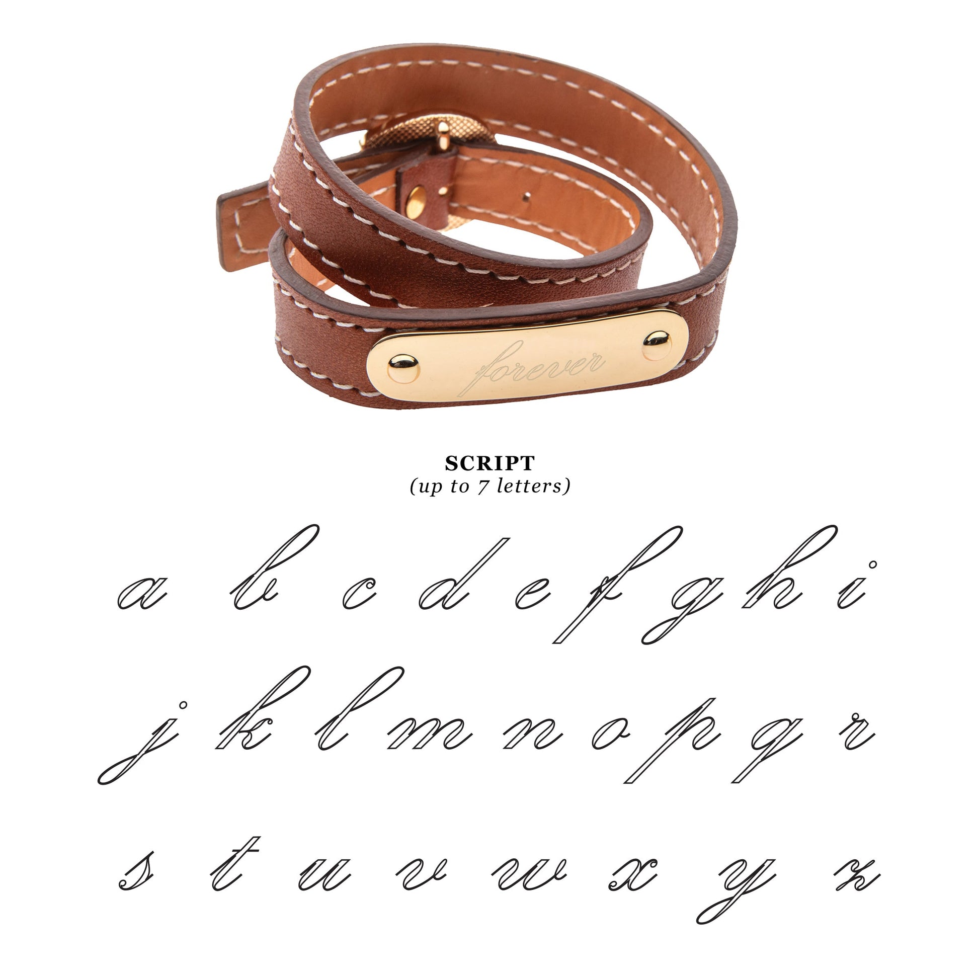 Personalize this cuff by selecting three letters or a date to engrave! For the initials, we offer the Janie Font, and for the date or script word we offer a Script font. For initials or a date, a delicate dot separates the letters or numbers.