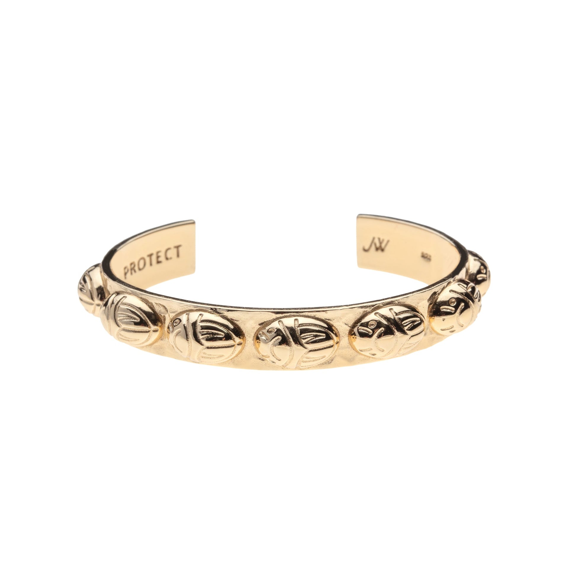 Keep safe. Introducing our new gold scarab cuff bracelet. The scarab (a beetle) has been used in jewelry for centuries. These amulets are worn as protection and symbolize the cycle of life. The scarab fits perfectly into our PROTECT collection, giving the wearer a physical reminder of the strength they have and the power to protect themselves and those they love.