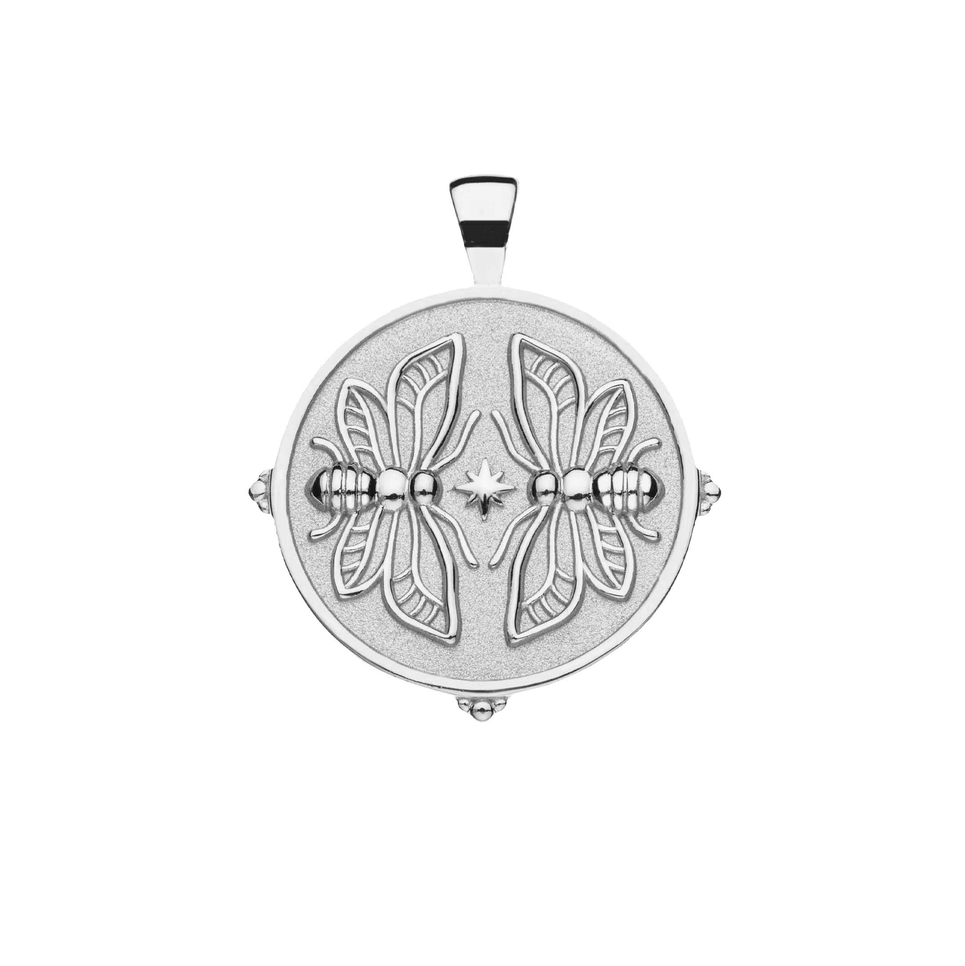 Coin pendant made of Sterling Silver plated in Rhodium, measuring 1.2" in diameter.