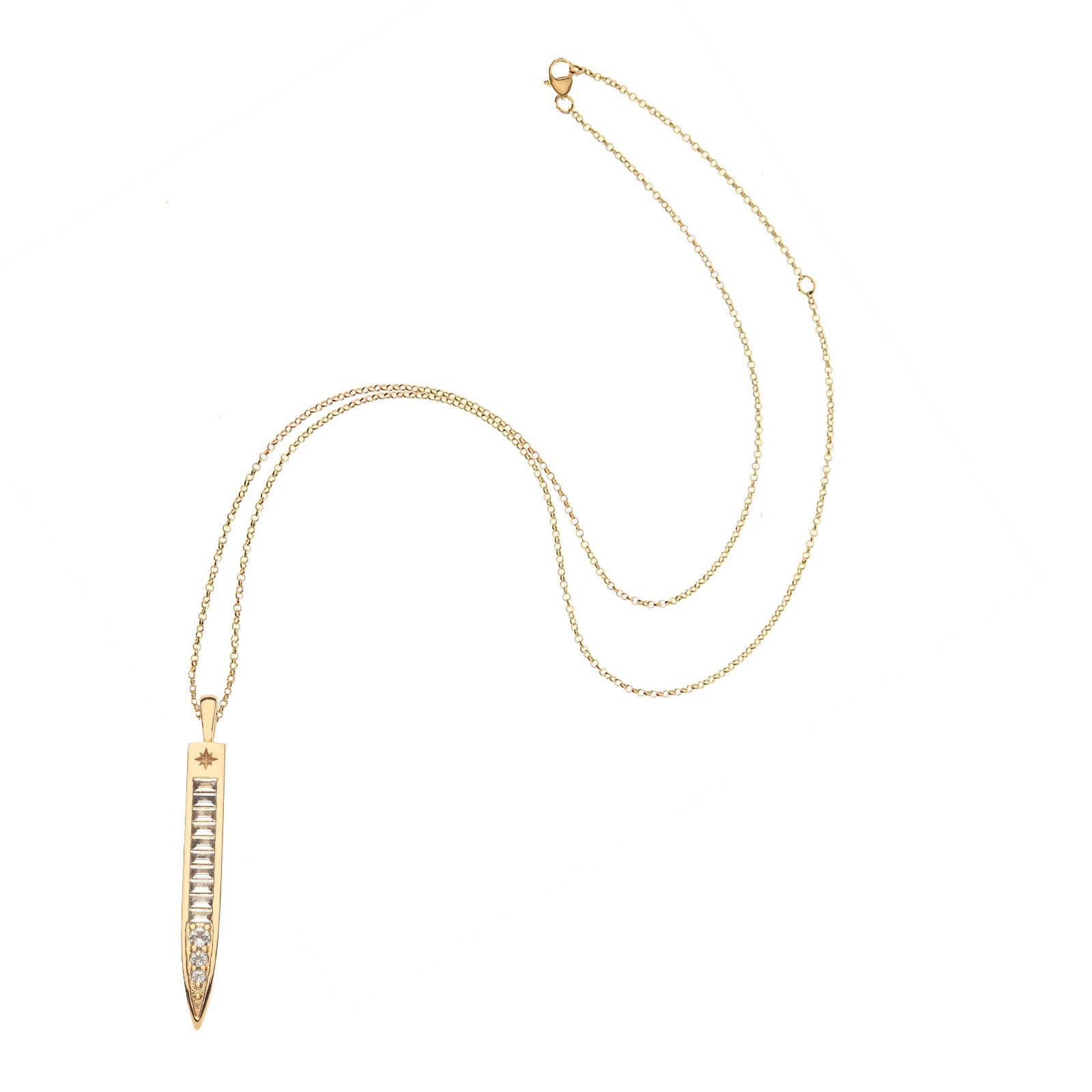 The Sun - the ultimate guiding star. The sun has been a symbol of life and strength in many cultures throughout history, so we encompassed the energy from its rays into a pendant. Embellished with columns of White Topaz baguette stones that catch the light, this pendant is sure to grant you the strength to face any challenge, and the good fortune to guide you toward brighter days.