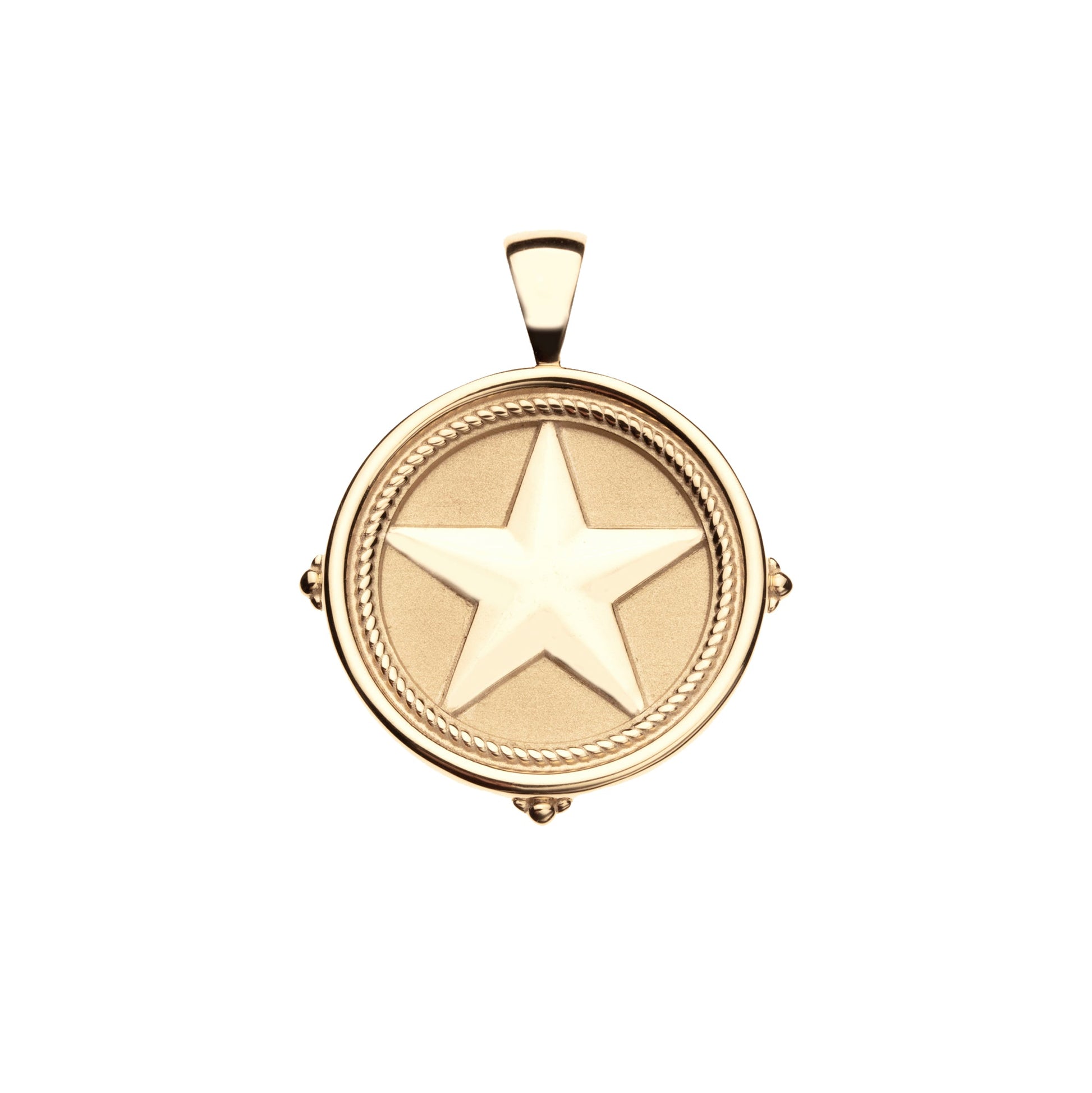 Coin pendant 1.2” in diameter in 14k yellow gold.